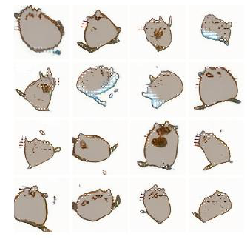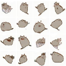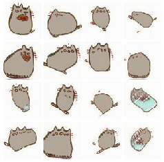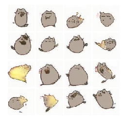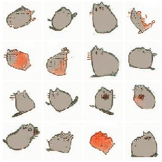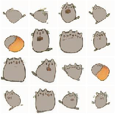 (I don't claim any ownership of Pusheen or anything Pusheen related, which is trademarked by Pusheen Corp.) It's no secret that my girlfriend and I both are huge fans of Pusheen the cat, which many people know from the cute Facebook sticker sets. So, for her birthday I set out to try to create a generative model to create cat pictures for her to enjoy! To set some expectations for this post, I only did this for a fun project and didn’t really know what I expected to get out of it given that in all the data available there are really only a handful of unique poses and scenes. Also, you really only need a roughly oval shaped gray blob with eyes to look like Pusheen, so the bar wasn’t that high. That being said I am happy with the outcome and think it produces interesting and (usually) realistic poses and positions. At first I thought of using a variational autoencoder to do the job, but I settled on a generative adversarial network instead because I was worried about blurriness in the images (and I had never made a GAN before and wanted to try).
