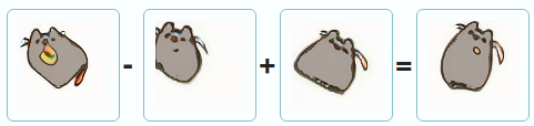 Here they take the input numbers for men with glasses, subtract from them the input numbers or a man without glasses, and then add to them the input numbers for a woman without glasses, and when they take the resulting numbers and generate images they get women with glasses! This is a super cool result of GANs that visibly shows us that the input numbers they take in have some meaning to us too. If you were asked to draw a picture of the result of "man with glasses" - "man" + "woman", you would likely draw a woman with glasses; this is what we ask the GAN to do here too, because these input numbers are the program's version of our thoughts when we internally visualize what the men and women with and without glasses look like. While this demo is admittedly not as clear for Pusheen as I'd wished, it's still interesting to play with.