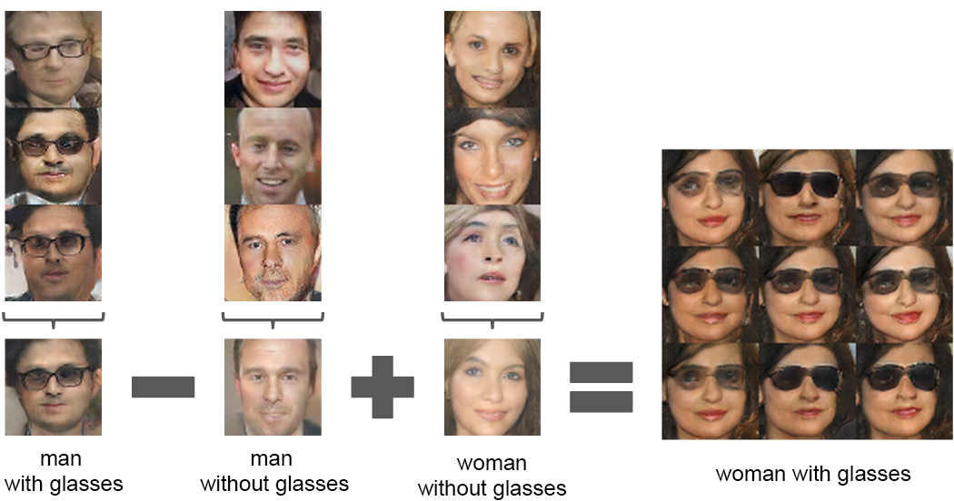 Another awesome property of GANs is that one can do arithmetic in latent space and the resulting latent vectors generate semantically reasonable images:
