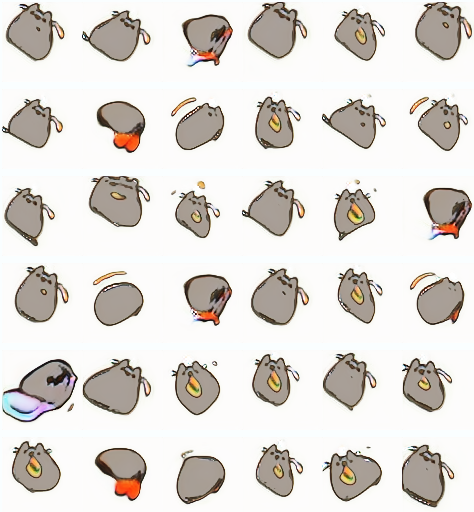 For some models there were definitely signs of mode collapse, and even some of the ones I picked as demos can lack novelty. I think this is in part attributed to the fact that while I was able to artificially expand the dataset with preprocessing tricks, there were only a few hundred original images to work with so the amount of variety the GAN could learn was limited from the start. I also found a trade-off between mode collapse and models that could produce both a healthy variety of images and some not fully formed Pusheens, and often times used the latter for the generators in this post. I know it isn't the most diverse generator, but even still I'm overall happy with the results.